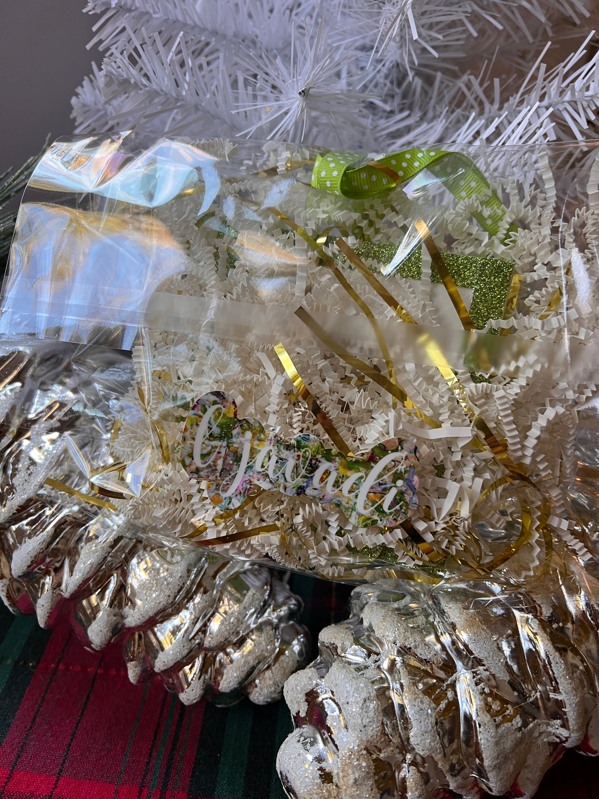 Finished with a bright green ribbon for hanging and a touch of glitter along the edges, every piece is signed, dated, and completely one-of-a-kind — ready to perch on your tree or gift to someone who adores handmade art.